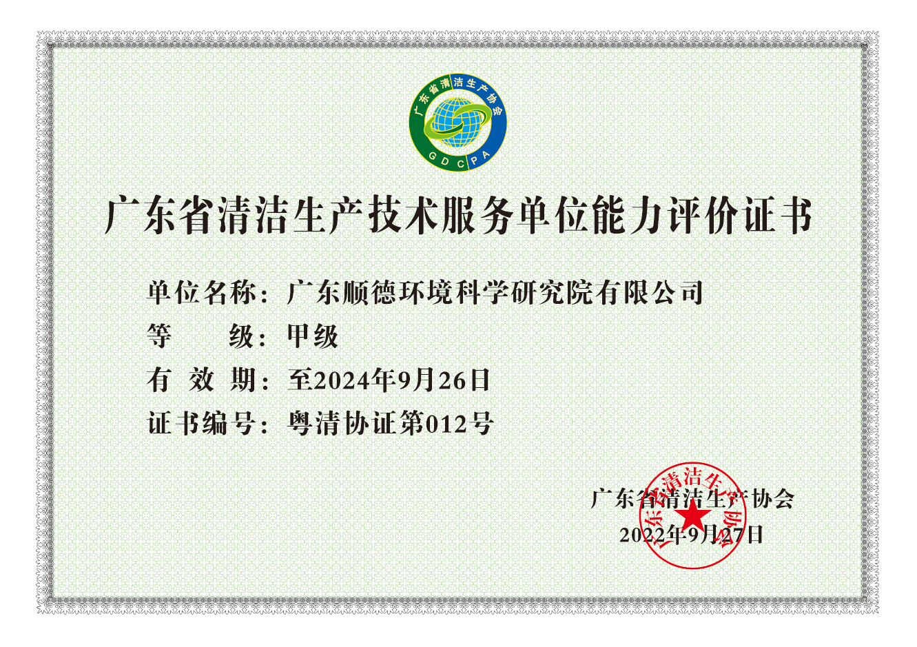 • 廣東省清潔生產技術服務單位能力評價證書